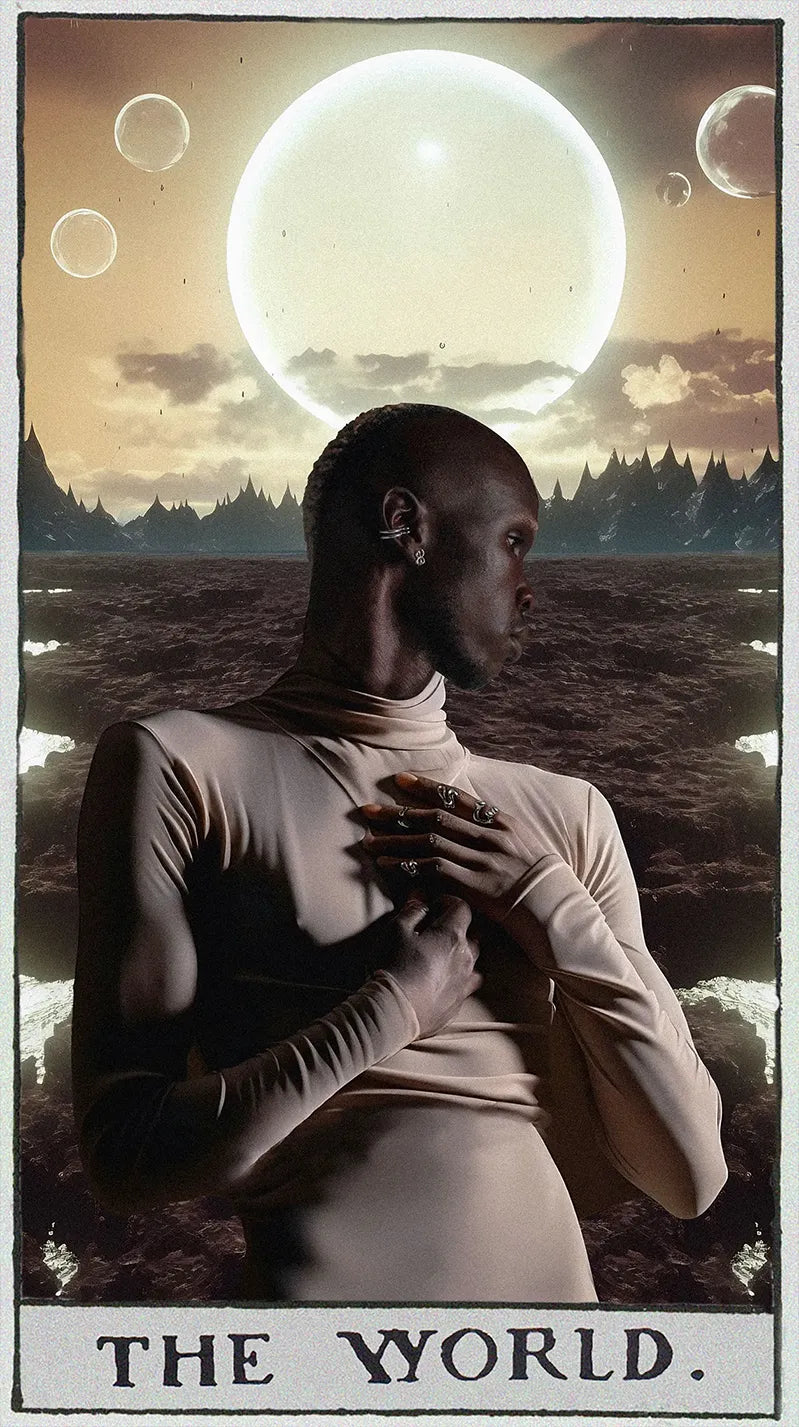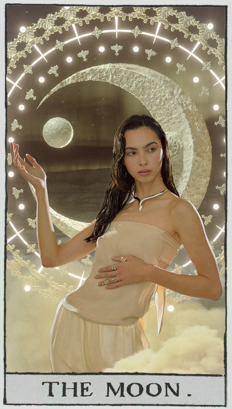 With the inaugural collection inspired by sacred rites of the past, the collection's campaign images were created to represent the harmony and discourse, and grey area between nature and construction. Presented as major tarot arcanas, these visuals were created to evoke the emblem and meaning behind these shamanic tools as reflections of the internal human state: the id (the moon), ego (the stars), and superego (the sun).